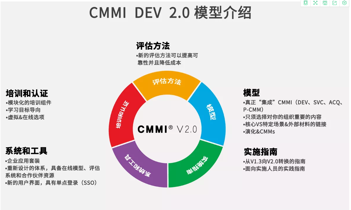 CMMI能力成熟度模型集成。CMMI是CMM模型的最新版本。早期的CMMI ( CMMI-SE/SW/IPPD ),SEI在部分國家和地區(qū)開始推廣和試用。隨著應(yīng)用的推廣與模型本身的發(fā)展,演繹成為一種被廣泛應(yīng)用的綜合性模型。CMMI全稱是Capability Maturity Model Integration, 即軟件能力成熟度模型集成,是由美國國防部與卡內(nèi)基-梅隆大學(xué)和美國國防工業(yè)協(xié)會(huì)共同開發(fā)和研制的,其目的是幫助軟件企業(yè)對(duì)軟件工程過程進(jìn)行管理和改進(jìn),增強(qiáng)開發(fā)與改進(jìn)能力,從而能按時(shí)地、不超預(yù)算地開發(fā)出高質(zhì)量的軟件。其所依據(jù)的想法是:只要集中精力持續(xù)努力去建立有效的軟件工程過程的基礎(chǔ)結(jié)構(gòu),不斷進(jìn)行管理的實(shí)踐和過程的改進(jìn),就可以克服軟件開發(fā)中的困難。CMMI為改進(jìn)一個(gè)組織的各種過程提供了一個(gè)單一的集成化框架,新的集成模型框架消除了各個(gè)模型的不一致性,減少了模型間的重復(fù),增加透明度和理解,建立了一個(gè)自動(dòng)的、可擴(kuò)展的框架。因而能夠從總體上改進(jìn)組織的質(zhì)量和效率。CMMI主要關(guān)注點(diǎn)就是成本效益、明確重點(diǎn)、過程集中和靈活性四個(gè)方面。